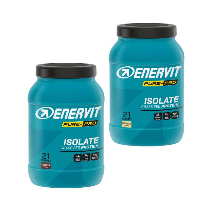 Integratore proteico con proteine isolate del siero di latte, disponibile in due gusti: cacao e vaniglia. Ogni dose contiene 24g di proteine, 6g di BCAA e zero zuccheri.