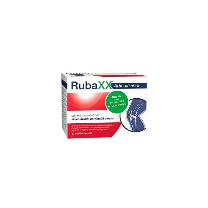 Rubaxx è un integratore che fa bene ad articolazioni, ossa, cartilagini. A base di collagene, glucosamina, condroitina, acido ialuronico, vitamina D e K, manganese e calcio.