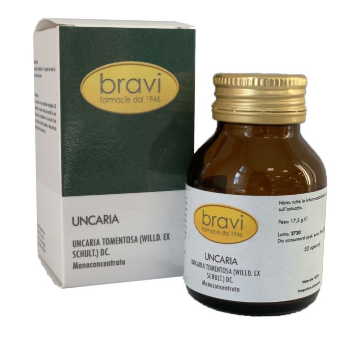 Uncaria (Uncaria tomentosa (Wild. ex Schult.) D.C., corteccia) e.s. tit. 1,1% Alcaloidi ossindolici totali, Uncaria (Uncaria tomentosa (Wild. ex Schult.) D.C.,corteccia), polv., addensanti: cellulosa microcristallina, amido di mais, antiagglomeranti: biossido di silicio, magnesio stearato, costituente della capsula: gelatina vegetale (idrossipropilmetilcellulosa).