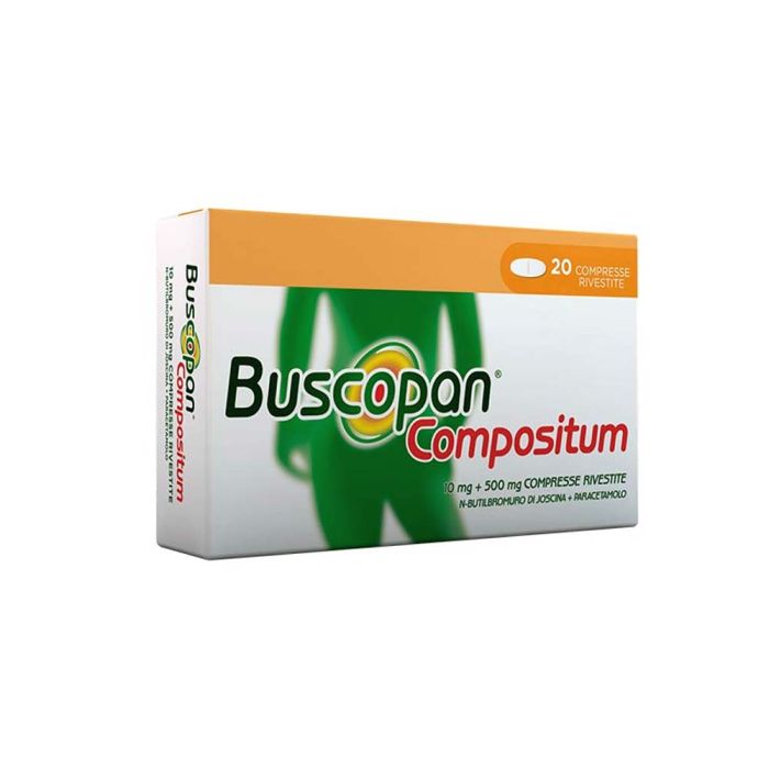 Buscopan Compositum contiene N-butilbromuro di joscina 10 mg, paracetamolo 500mg.