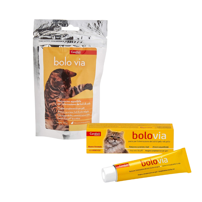 Bolo Via pasta contiene sostanze che ammorbidiscono le feci, lubrificano il tratto intestinale e facilitano l’eliminazione dei boli di pelo, responsabili di sindromi occlusive nel gatto.