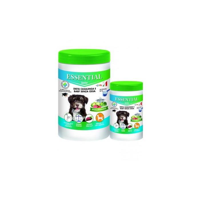 Essential cane Junior è un integratore vitaminico e minerale per dieta casalinga o a eliminazione o BARF senza ossa.