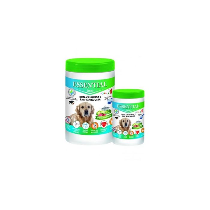 I cani anziani hanno bisogno di attenzioni in più: va benissimo adottare la dieta casalinga o Barf senza ossa o a eliminazione, ma attenzione a non privarlo dei giusti nutrimenti proprio adesso: l'integratore Essential Senior è arricchito di Condroitinsolfato, Glucosamina e manganese per le articolazioni e Taurina e Carnitina sostengono la funzionalità cardiaca.