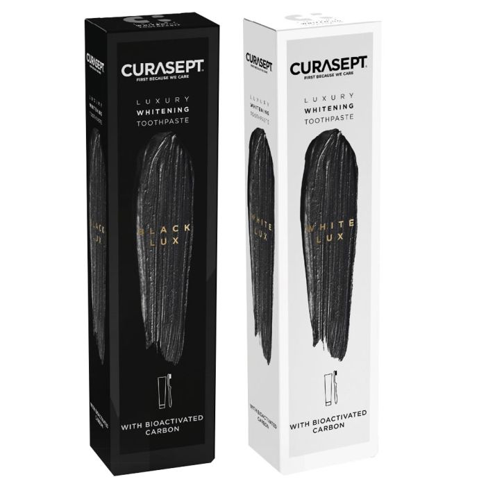 Il dentifricio sbiancante di Curasept Whitening Luxury con carbone bioattivo è abbinato allo spazzolino, e anch'esso con carbone attivo.