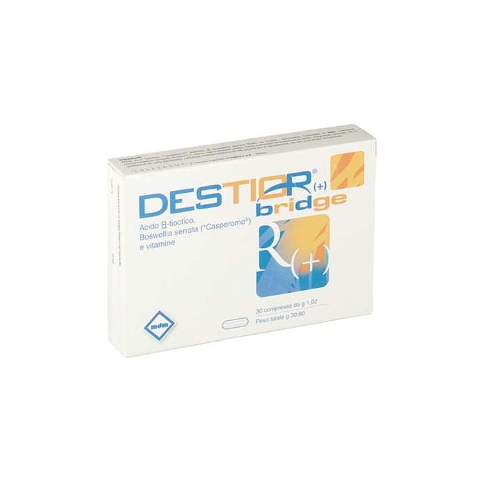 A base di Acido Alfa-Lipoico, Boswellia e vitamine, Destior Bridge 30 compresse è utile per spegnere dolori ed infiammazioni legati a neuropatie e radicolopatie così da migliorare il benessere dell'individuo che ne soffre.