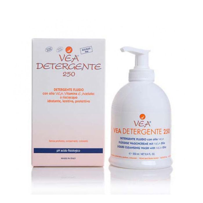 Con Ph che rispetta quello fisiologico della pelle, il Detergente Fluido 250 VEA è delicato e protetttivo