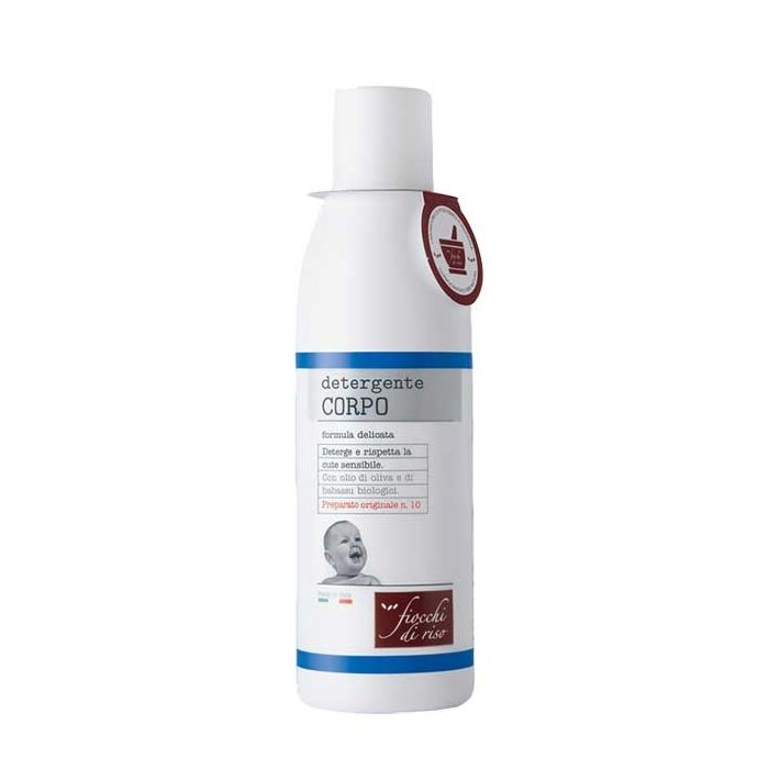 Il detergente corpo Fiocchi di Riso contiene tensioattivi delicati di derivazione vegetale da olio di babassu e di riso dermocompatibili che consentono una detergenza delicata ed adeguata senza alterare il film idrolipidico.