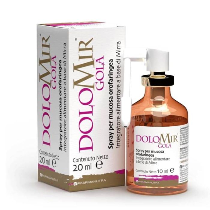 Dolomir Gola è un integratore alimentare in spray a base di mirra estratto idroglicerico (Commiphora myrrha) e sodio ialuronato, indicato per favorire la funzionalità della mucosa orofaringea.