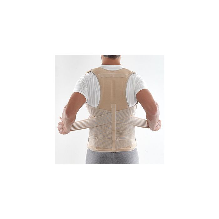 Dispositivo medico indicato sia in fase di riabilitazione che prevenzione: Corsetto dorso lombare con spallacci imbottiti per il comfort sotto ascellare. Dotato di scudo posteriore in Kidex® Thermoplastics termoformabile amovibile e ad alta resistenza alla compressione con funzione di sostegno del rachide dorso lombare.