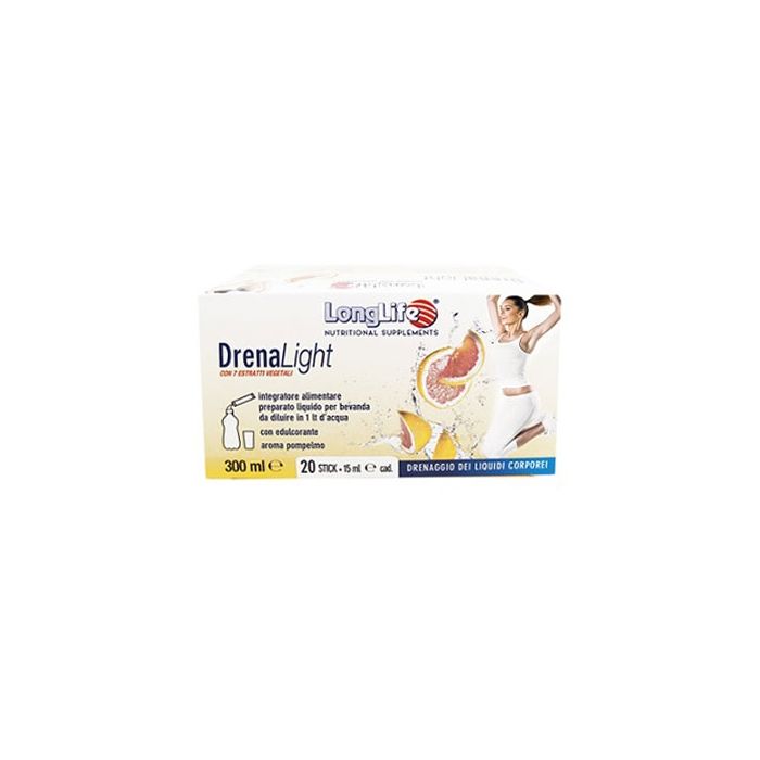 Long Life propone l'integratore DRENA LIGHT 20 stick, da assumere 15 ml diluito in 1 litro d'acqua e berne un po' durante tutta la giornata.