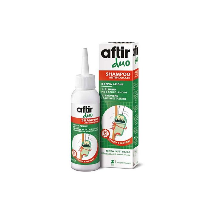 Aftir oltre al trattamento antiparassitario contro i pidocchi, propone lo shampoo Duo Shampoo che va a estendere l'efficacia e a minimizzare il rischio che i pidocchi non vengano totalmente combattuti.