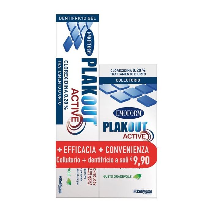 - Contiene un collutorio Plakout Active 0,20%: Indicato in tutti i casi di trattamento d’urto per un’azione antiplacca intensiva. Particolarmente consigliato nei casi di parodontite. Ideale per trattamenti pre e post chirurgici.