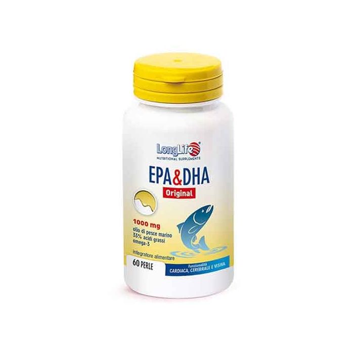 EPA DHA di LONG LIFE è un integratore di grassi polinsaturi omega-3 EPA (acido eicosapentaenoico) e DHA (acido docosaesaenoico)