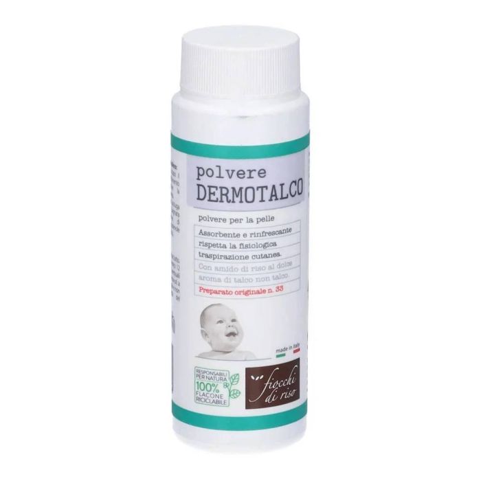 Dermotalco Fiocchi di Riso permette di assorbire velocemente l'umidità della pelle dopo il cambio pannolino e il bagnetto, rispettandone la traspirazione. La sua formulazione con ingredienti dermocompatibili dona alla pelle un effetto rinfrescante.