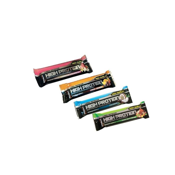 Barretta ad alto tenore proteico. Disponibile in quattro diversi gusti: Vanilla-Strawberry Choco Orange Coconut Halzenut