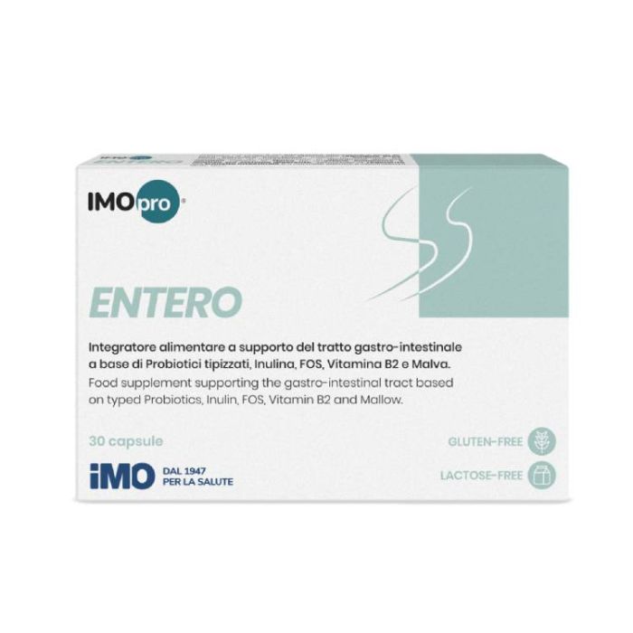 IMOPRO Entero è un integratore simbiotico che combina probiotici vivi di origine umana (15 miliardi UFC/capsula) con prebiotici (FOS, inulina, malva) e vitamina B2, per favorire l’equilibrio della flora batterica intestinale e il benessere del tratto gastrointestinale.