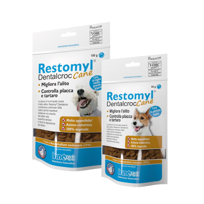 Per la cura e l'igiene della bocca e del cavo orale del cane, prova Restomyl Dentalcroc di Innovet: supporto nutrizionale per la salute del cavo orale, previene la formazione e l'adesione della placca sulla superficie dentaria, migliorando l'alito e rallentando la deposizione del tartaro.