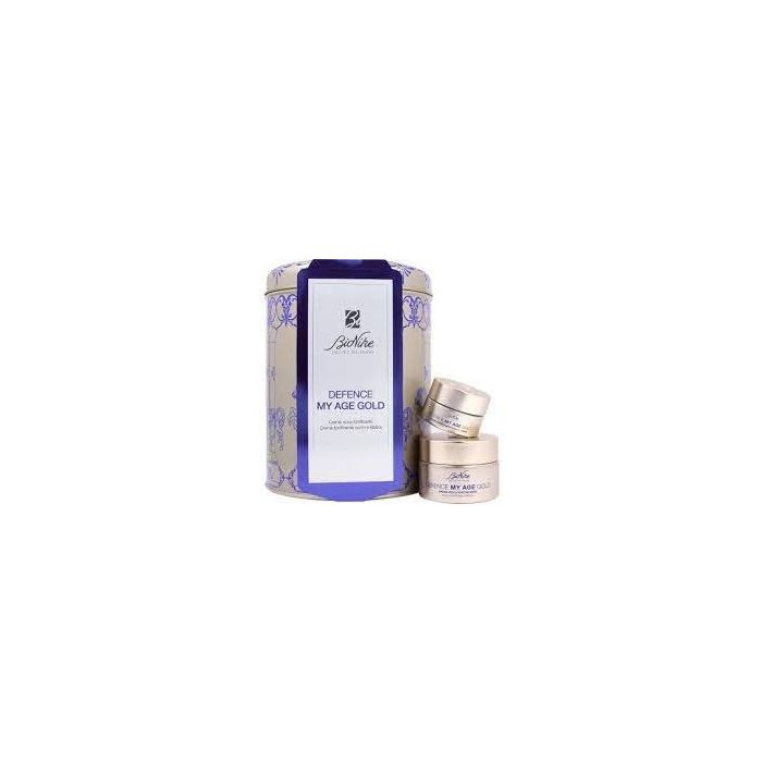Il cofanetto della linea Defence My age GOLD con le due creme essenziali nel trattamento ridensificante e antietà per pelli mature.