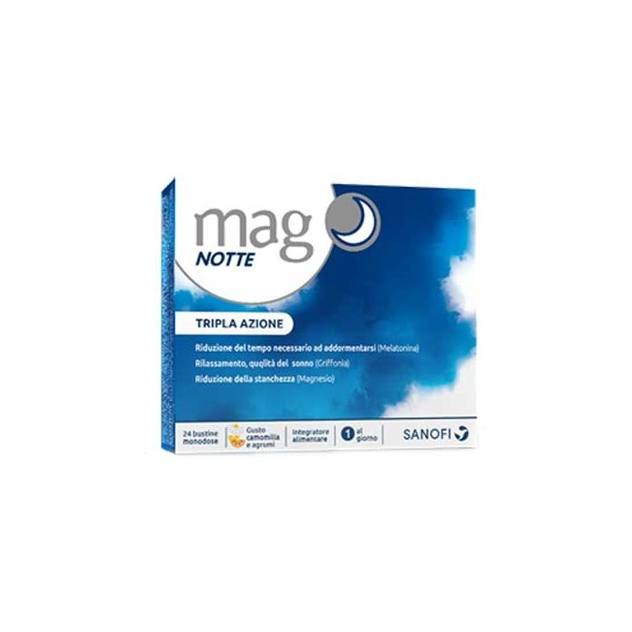 Mag Notte 24 bustine contiene magnesio e melatonina, la regina del rilassamento mentale che favorisce il sonno.