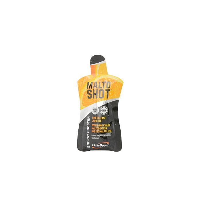 Ethicsport Malto shot 30 ml è un gel contenente carboidrati, isomaltulosio e maltodestrine per un apporto frazionato di energia di lunga durata.