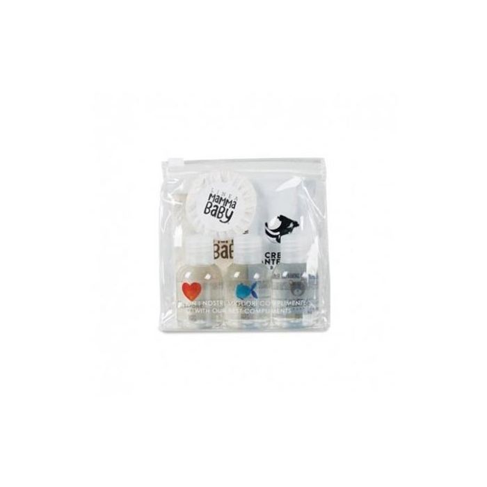 La pochette trasparente di Mamma Baby contiene tutto il necessario per l'igiene e la cura del bimbo dalla pelle delicata e sensibile.
