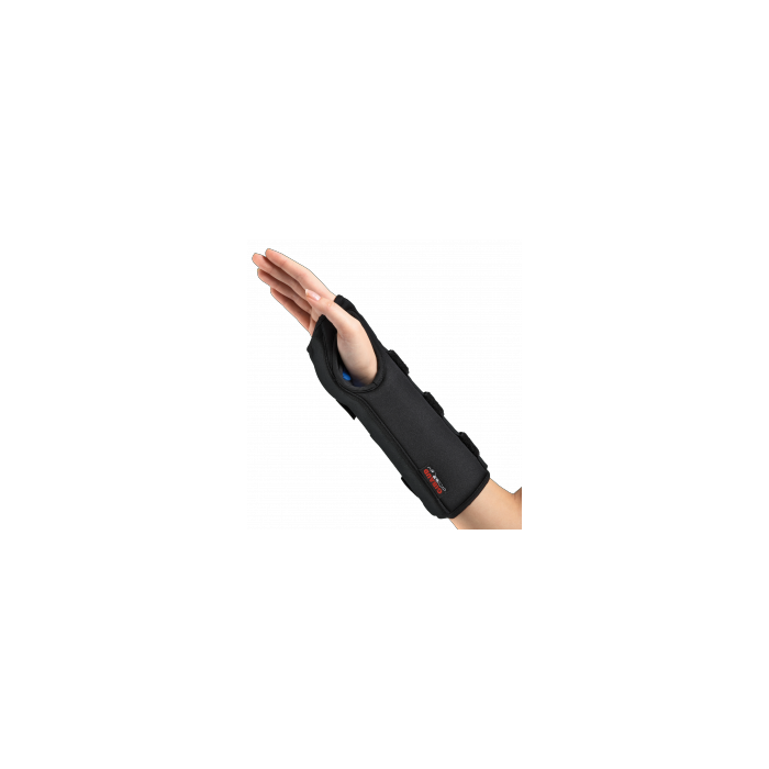 Immobilizzazione garantita da: stecca palmare rigida di forma anatomica modellabile, braccio di leva lungo, due stecche dorsali, quattro cinghie di regolazione.