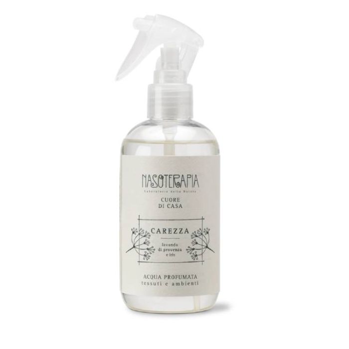 Carezza Lavanda e Iris Nasoterapia è un'acqua profumata in spray da 250 ml, formulata con idrolati puri di lavanda e iris per profumare tessuti, biancheria e ambienti domestici con un'essenza floreale calmante e avvolgente. 100% naturale e biologica, non contiene alcool aggressivo, rendendola sicura per uso frequente su stoffe e arredi.