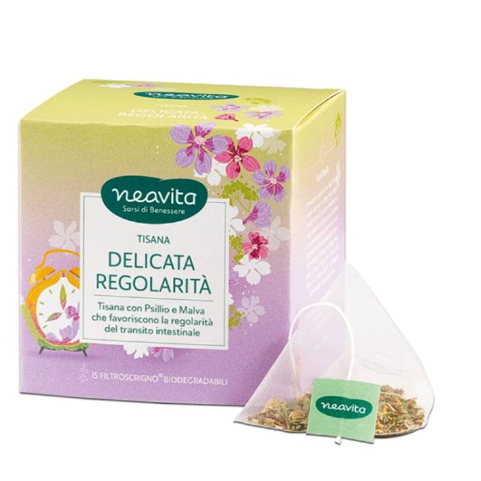 Neavita Delicata Regolarità si presenta in confezione da 18 filtri Filtroscrigno (tecnologia brevettata per infusione ottimale senza polvere),a base di psillio (Plantago psyllium L.) semi per regolare il transito e ridurre assorbimento di zuccheri e grassi, malva (Malva sylvestris L.) fiori e foglie per azione emolliente e lenitiva, liquirizia, angelica, finocchio, menta piperita e inulina da cicoria per supporto prebiotico e digestivo
