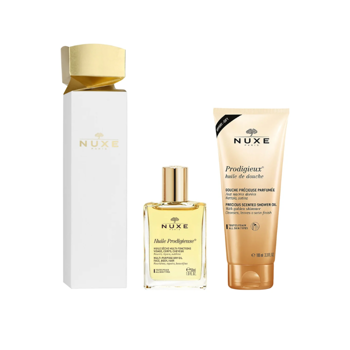 Kit regalo dei classici Huile Prodigieuse di Nuxe: Olio Idratante Classico 30ml e Olio Doccia 100ml per una beauty routine dalla sensualità inimitabile.