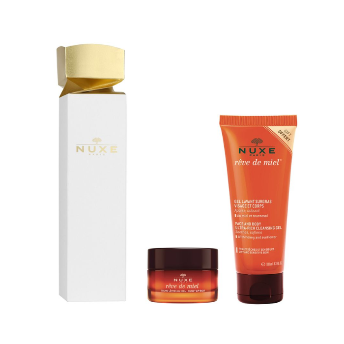 Cofanetto che racchiude due trattamenti iconici per nutrire e proteggere pelle e labbra: Reve De Miel Baume Levres 15g + Reve De Miel Doccia Gel Lavant Surgrass 100ml.