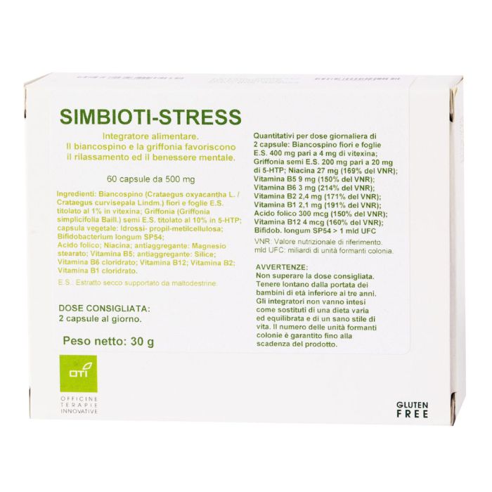 Simbioti-STRESS è contiene batteri probiotici ed estratti vegetali (Biancospino e Griffonia), insieme alle vitamine del gruppo B.