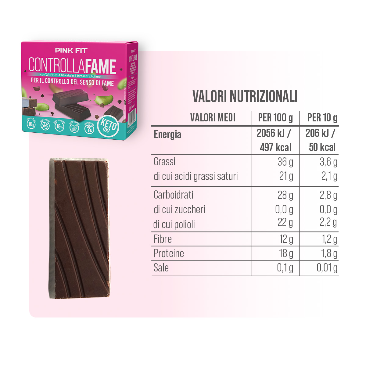 Pink Fit Controlla Fame è un integratore alimentare in tavolette monoporzione di cioccolato fondente 70% monorigine Ecuador, con BlackNAT® (un estratto di riso vegetale a base di origine italiana) e l’estratto naturale di Griffonia titolata.