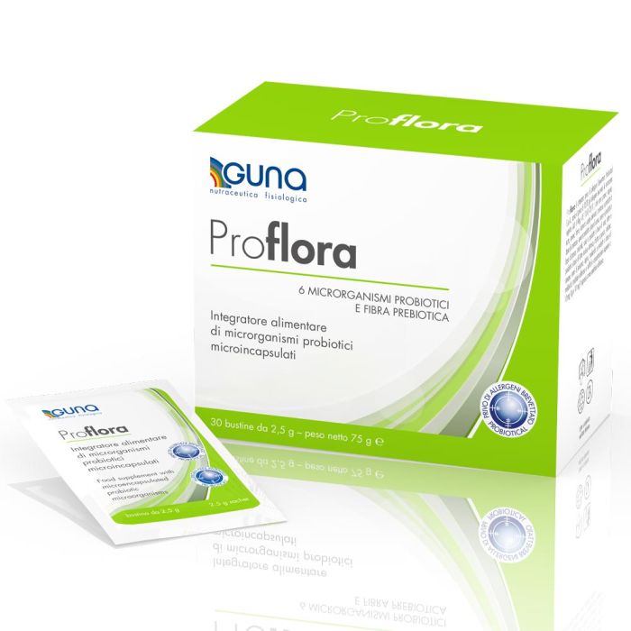 Guna ProFlora riequilibra l'ecosistema intestinale. Grazie alla sua innovativa formulazione brevettata, Proflora di Guna riesce a colonizzare l'intestino con i suoi 6 ceppi differenti di probiotici. La tecnologia utilizzata è quella della microincapsulazione gastroprotetta: un termine complicato per dire che i fermentici lattici riescono a superare l'ambiente dello stomaco restando vitali e pronti ad insidiarsi nel nostro intestino. Inoltre ProFlora contiene anche dei prebiotici: FOS, cioè frutto-oligosaccaridi che stimolano lo sviluppo dei ceppi fisiologicamente presenti nella nostra flora intestinale.