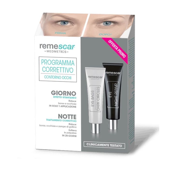 Contiene Remescar Borse e Occhiaie + (Nuovo) Remescar Trattamento Notte Riparatore. Contorno Occhi perfetto per 24 ore.