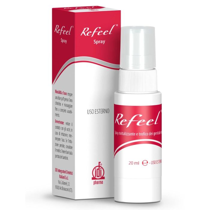 - Utilizzo cronico: 1-2 puff la sera per 15 sere consecutive. Uno studio clinico condotto in crossover ha dimostrato che pazienti con disfuzioni della sfera sessuale hanno beneficiato del trattamento con refeel spray in cronico (indipendentemente dalla stimolazione orgasmica). Il risultato è stato un maggiore trofismo e sensibilità dei genitali esterni.