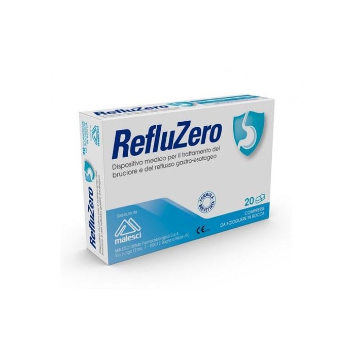 RefluZero è un Dispositivo Medico in compresse masticabili, a base di Condroitin-solfato, che aderisce alle mucose e protegge meccanicamente le pareti di stomaco ed esofago. Altri componenti sono Sodio Ialuronato, con effetto riparatore delle mucose e Idrossido di Alluminio, valido antiacido. Contiene anche Calcio Carbonato, utile antiacido per alleviare i disturbi dell'acidità e del rigurgito di succhi acidi.