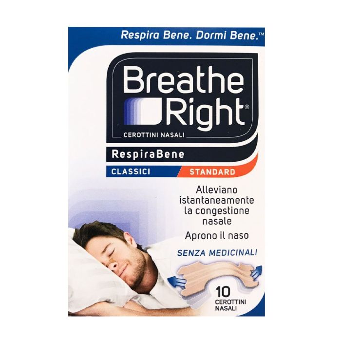 Rinazina RespiraBene cerottini nasali è un Dispositivo Medico che dona sollievo immediato dal naso chiuso: permette di introdurre fino al 31% di aria in più rispetto alla respirazione senza cerottini nasali.