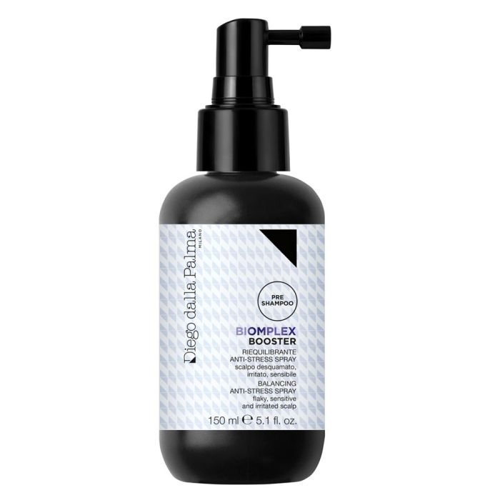 Booster pre shampoo antistress e riquilibrante di Rvb Lab by Diego Dalla Palma dotato di una pompa spray che eroga il prodotto con precisione lungo il cuoio capelluto sensibile ed irritato.