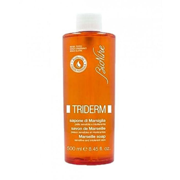 Il Sapone di Marsiglia della Linea Triderm di Bionike è un detergente liquido ideale per la detersione della pelle, soprattutto di quella più sensibile, delicata e intollerante. E' un detergente privo di conservanti per ridurre al minimo i rischi di allergie e irritazioni. E' adatto per ottenere un'accurata detersione della cute rispettando il suo naturale equilibrio; ideale per lavaggi frequenti anche della pelle più sensibile. L'utilizzo quotidiano rende possibile una detersione accurata senza aggredire la pelle e provocarne secchezza.
