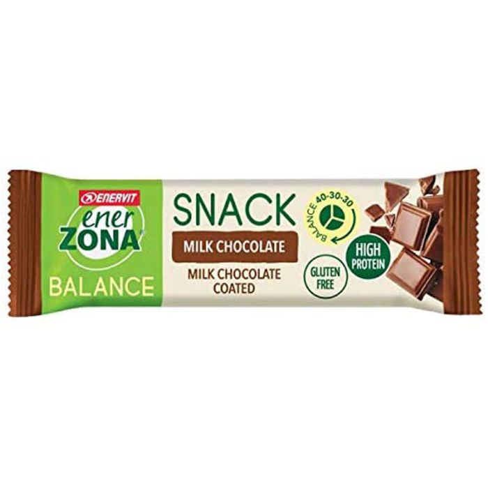 Snack 40-30-30 al gusto Milk e Cioccolato al latte della marca Enerzona fornisce un apporto calorico e proteico bilanciato.