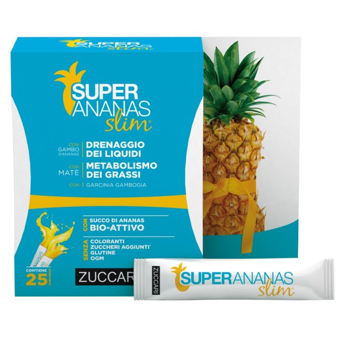 Una sola bustina al giorno di SUPER ANANAS SLIM e la tua linea ne gioverà sia in termini di metabolismo dei grassi, grazie a Garcinia (sostegno linea) e Maté (titolato al 2% in caffeina, snellente per eccellenza), sia in termini di drenaggio dei liquidi, per l'azione del gambo d'ananas, che è la parte che scartiamo tutti quando scegliamo questo frutto, ma che fa meglio. Infatti esso è titolato in Bromelina e assumendo una bustina è come se tu mangiassi un quarto di ananas.