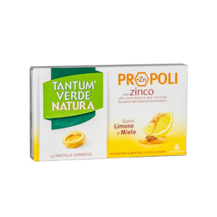 Tantum Verde Natura Miele e Limone cura il tuo mal di gola con la naturale efficacia della propoli ed in più alza le tue difese immunitarie grazie a Zinco e Vitamina C. Le pastiglie sono gommose, al gusto miele e limone: molto gradevoli da succhiare.