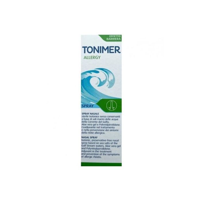VENDITA ONLINE TONIMER ALLERGY SPRAY NASALE 20ml Problematica: Anche tu non sopporti l'allergia? Tonimer Allergy Spray è la soluzione che fa per te! Caratteristiche prodotto: Tonimer Allergy Spray Nasale ha una soluzione salina sterile e isotonica che agisce sulle mucose nasali liberandole da: - pollini; - polvere; - peli di animali; - inquinanti ambientali. Vantaggi Grazie al suo effetto lenitivo e curativo, le tue mucose nasali torneranno come nuove. Modalità di utilizzo Leggere attentamente quanto riportato nel foglietto illustrativo presente nella confezione. Ingredienti Sali Marini Delle Acque Della Corrente Del Golfo, Aloe Vera Del, Polivinilpirrolidone, Sodio Citrato, Acido Citrico, Acqua Per Preparazione Iniettabile. Avvertenze e controindicazioni - Evitare il contatto con gli occhi - Tenere fuori dalla portata dei bambini - Non applicare su ferite aperte