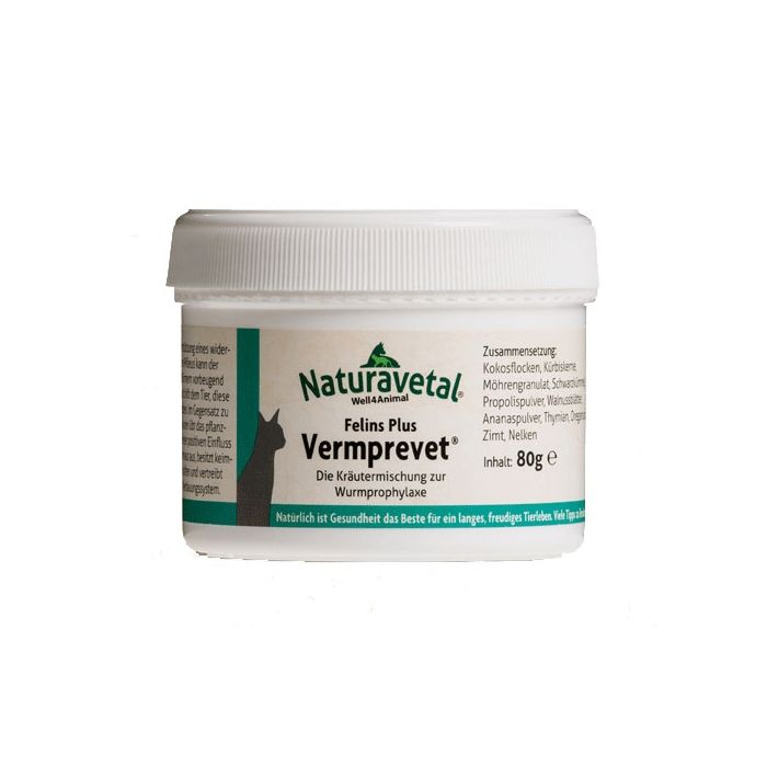 Un efficace mix di erbe, VERMPREVET 80 g naturavetal per gatti che non danneggia l'ambiente e l'equilibrio intestinale poiché combatte i vermi e altri parassiti in modo naturale, senza sostanze chimiche. Così sei certo di fare solo del bene al tuo gatto in completa serenità.E' da mescolare al suo cibo, in seguito ad aver accurato la presenza di vermi nel suo intestino.