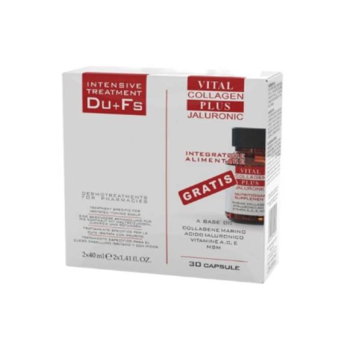 DU+FS è un trattamento specifico per la cute irritata e con prurito. Il cofanetto contiene anche una confezione di Vital Plus Collagen Plus Jaluronic in omaggio.