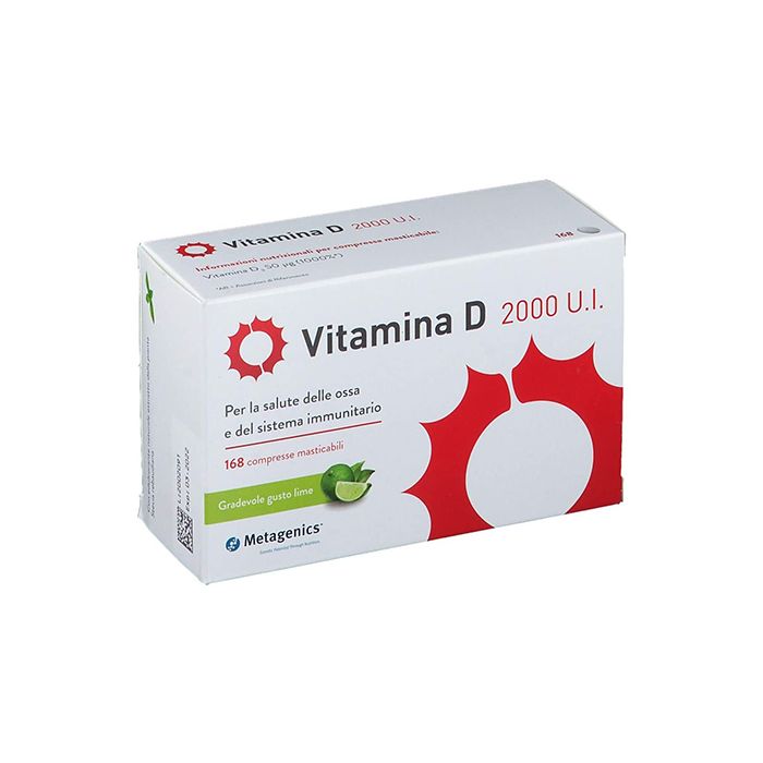 Il dosaggio elevato di Vitamina D 2000 ui Metagenics protegge il sistema immunitario e la salute delle ossa, senza glutine. Compresse masticabili al piacevole aroma di lime.