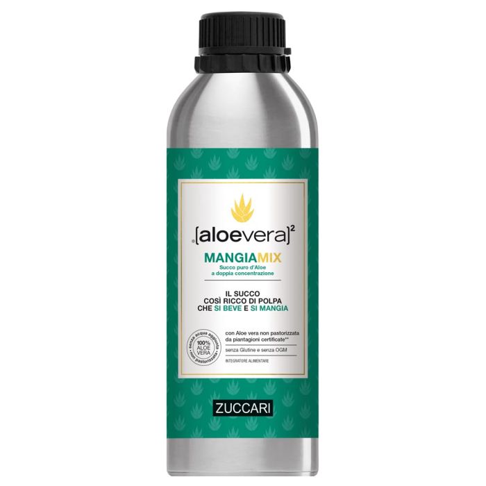 Il nuovo succo di aloe Mangiamix rimane ultra concentrato ma contiene pezzi da mangiare.